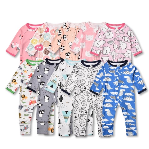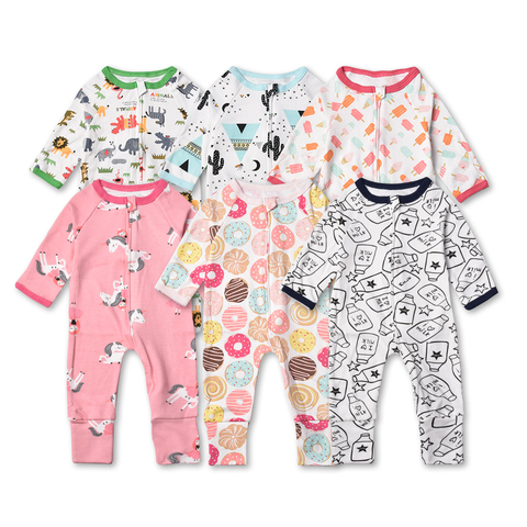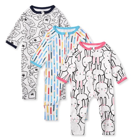 Ropa de bebé neutral, 100% de algodón con cremallera peleles, pijamas de manga larga estampados para bebés, venta al por mayor